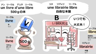 ダジャレで覚える 【ダジャレで覚えるフランス単語3】 「500gの本」と「自由な本屋」 un livre d'une livre(500gの本)と une librairie libre (自由な本屋) 「ダジャレで覚えるフランス単語」その3です。 今回覚えるのはスペルを間違えやすいこれらの単語です。「v」と「b」の違いに注意... 2025.09.28 ダジャレで覚える