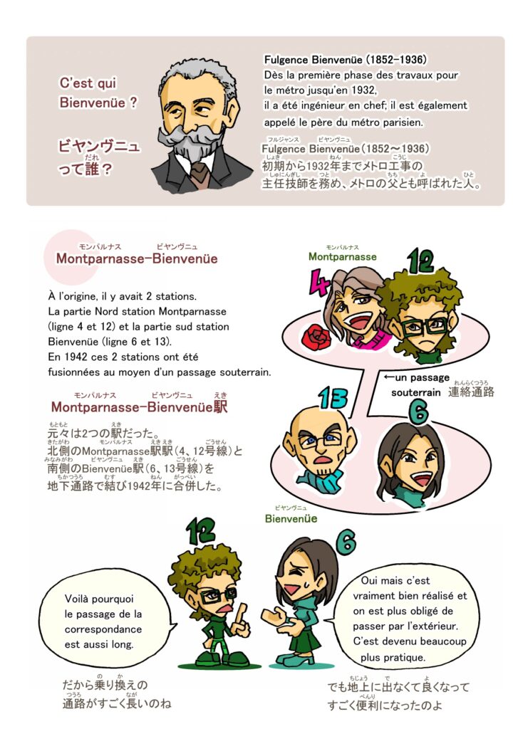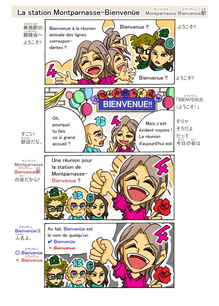 この二つは発音は同じですがスペルが若干違います。私も含め多くの人が「ようこそ、モンパルナス駅」と勘違いされますがこの「ビヤンヴニュ」は人名です。元々別の駅だった「モンパルナス駅」と「ビヤンヴニュ駅」が合体して「モンパルナス・ビヤンヴニュ駅」になりました。(下のコメントも参考)