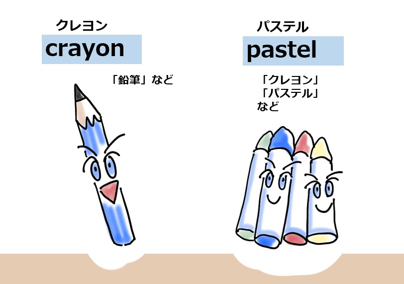 日本で言う「クレヨン」は「pastel」 パステルと言います。 もしくは「crayon pastel」 クレヨン・パステルと言いうこともあります。「crayon」 クレヨンには「鉛筆状のもの」という意味もあるため「鉛筆状のパステル」という感じですかね。