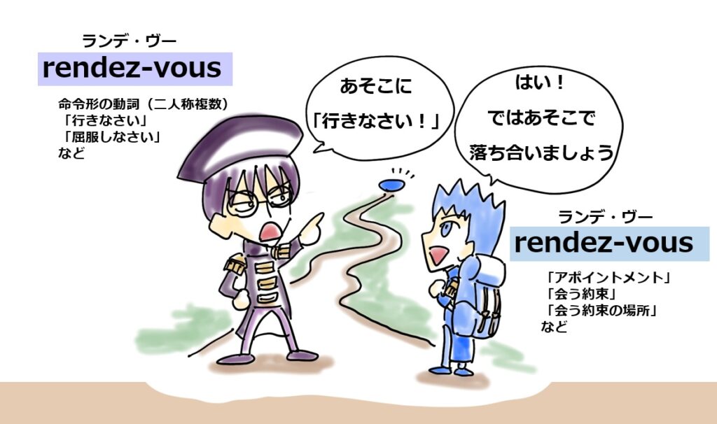 この「rendez-vous」 ランデ・ヴーという単語はかなり特殊な単語で、品詞としては名詞ですが形としては動詞の命令形の文章です。動詞「rendez 」 ランデ の原形は「rendre 」 ランドル、「se rendre 」の形で「行く」とか「屈服する」という意味になります。なのでこれを命令形にすると「行きなさい」とか「屈服しなさい」という意味になります。元々は軍隊が集結する場所を指す言葉として使われていたようです。