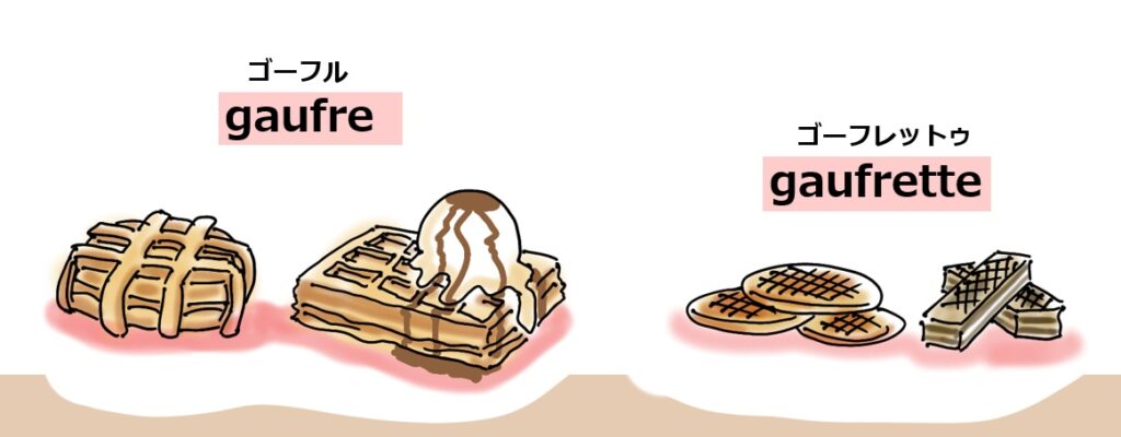 ちなみにgaufre ゴーフルに「小さい」という意味の接尾辞「~ette」エットゥを付けるとgaufrette ゴーフレットゥになります。これは小さなワッフルとかウェハースを指します。