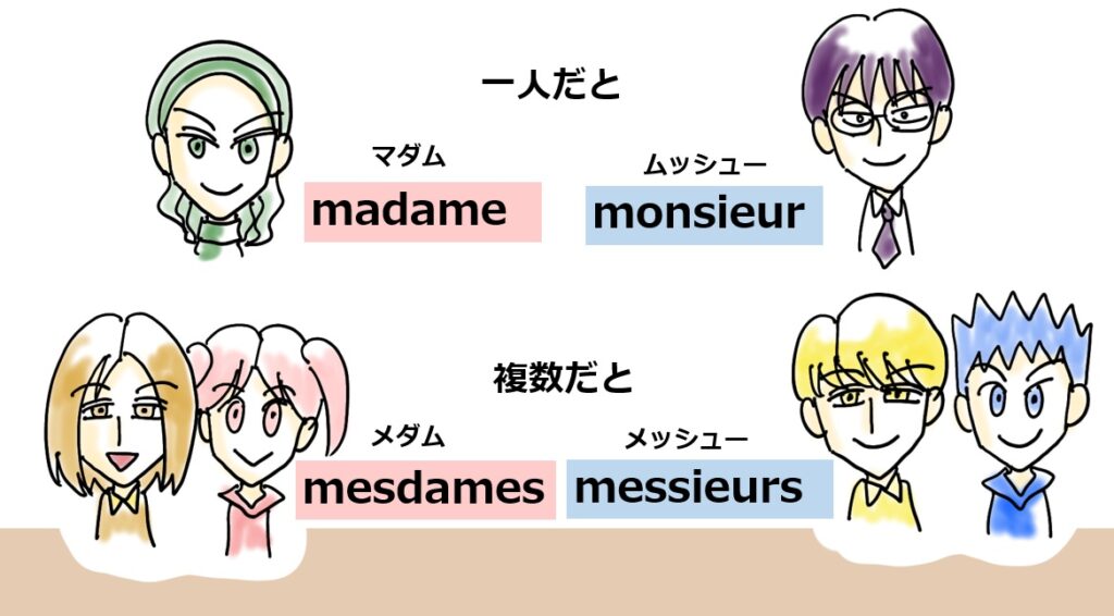 ちなみに女性が複数いると所有形容詞も複数形に変わるためmesdames メダムと呼び、男性が複数いるとmessieurs メッシューと呼びます。
