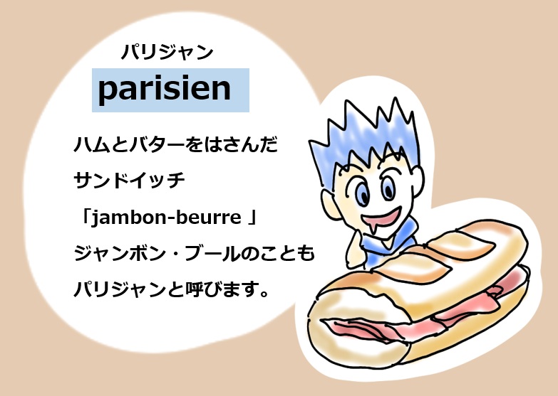 パンとしてはbaguette バゲットゥよりちょっと短くて太い感じです。サンドイッチにもよく使われ、ハムとバターをはさんだサンドイッチjambon-beurre ジャンボン・ブール のことも別名「parisien パリジャン」と呼びます。