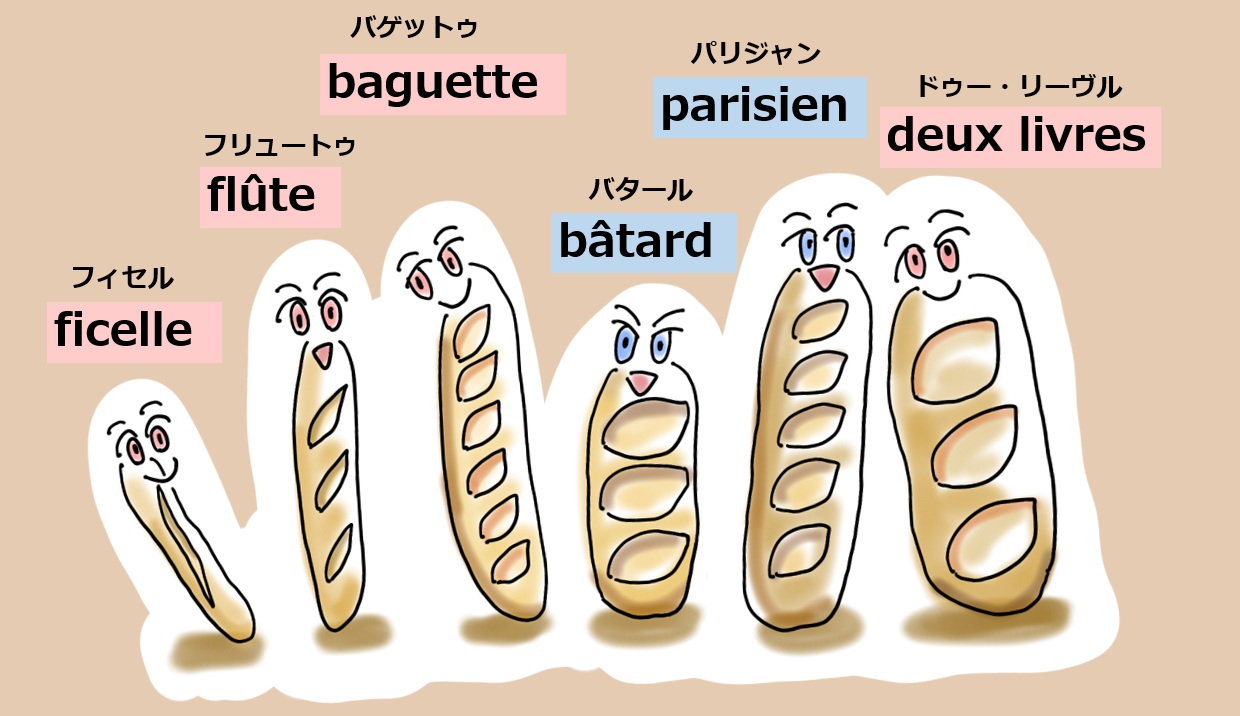 今回考えるのはficelle フィセル、flûte フリュートゥ、baguette バゲットゥ、bâtard バタール、parisien パリジャン、deux livres ドゥ―・リーヴルです。