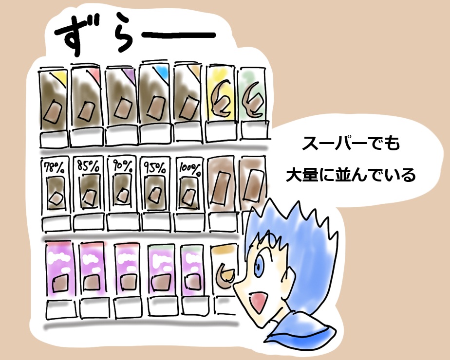 スーパーマーケットでもチョコレートコーナーには大量のチョコレートが置かれています。板チョコだけで棚2~3つを占拠していたりするほどです。板チョコはメーカー別、カカオ含有量別、ミントやオレンジの皮が入ったものなど色々な種類があります(分厚い板チョコ3枚を1セットにした袋が3ユーロくらいで売ってたりもします。)