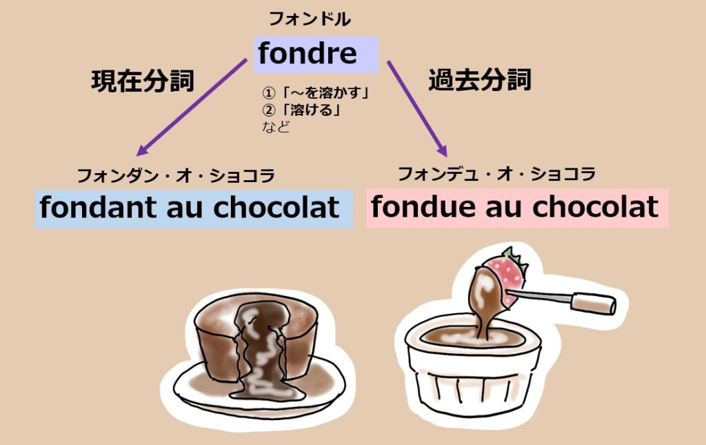 この「fondant au chocolat」フォンダン・オ・ショコラと「fondue au chocolat」フォンデュ・オ・ショコラ、なんかスペルが似てると思いませんか?それもそのはず、どちらも「~を溶かす」「溶ける」を意味する動詞 fondre フォンドル から来ているからです。fondre フォンドル の現在分詞形がfondant フォンダン、過去分詞形の女性形がfondue フォンデュ になります。今回はfondant フォンダン も fondue フォンデュもそれぞれ名詞として使用されています。なので直訳だとどちらも「とろけたチョコレート」といった意味になりますね。