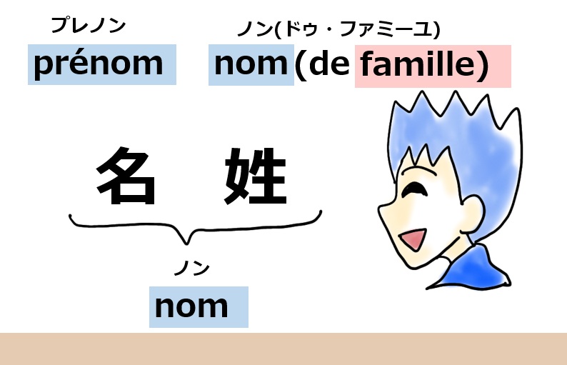 フランスでも同じで「nom」 ノン という単語は「名前」という意味ですが特に「姓」のことを指します。(「姓」のことはもっと丁寧にnom de famille ノン・ドゥ・ファミーユ とも言います。「famille 」 ファミーユ は「家族」の意味です。)そして「下の名前」のことは「prénom 」 プレノン と言います。
