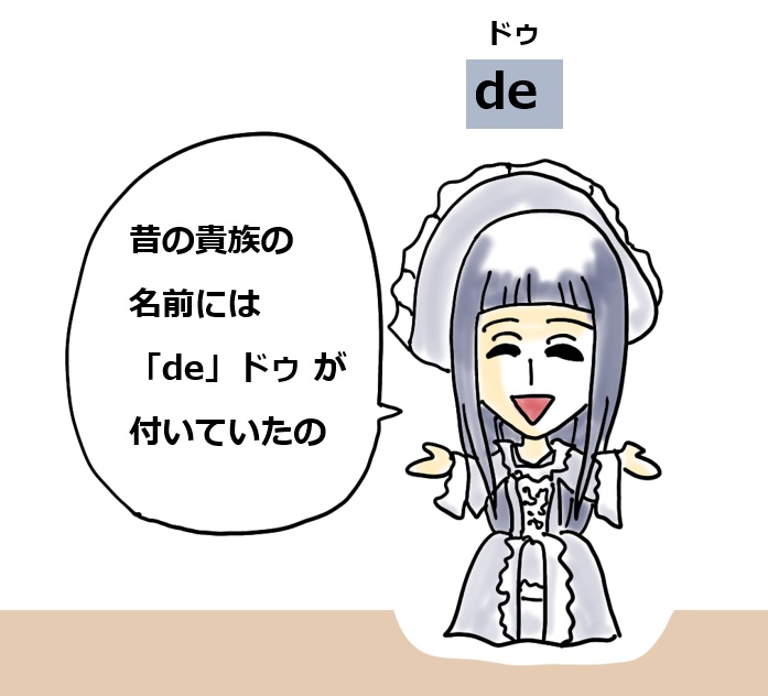 ではその前についているdeドゥ はなんでしょうか?deドゥ は「~の」という意味の前置詞です。昔のフランスの貴族の姓にはこのdeドゥ が付けられていました。(他の国でも同じようなものがあります。例えばドイツだと「Von」 フォン が付いたりします。)