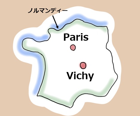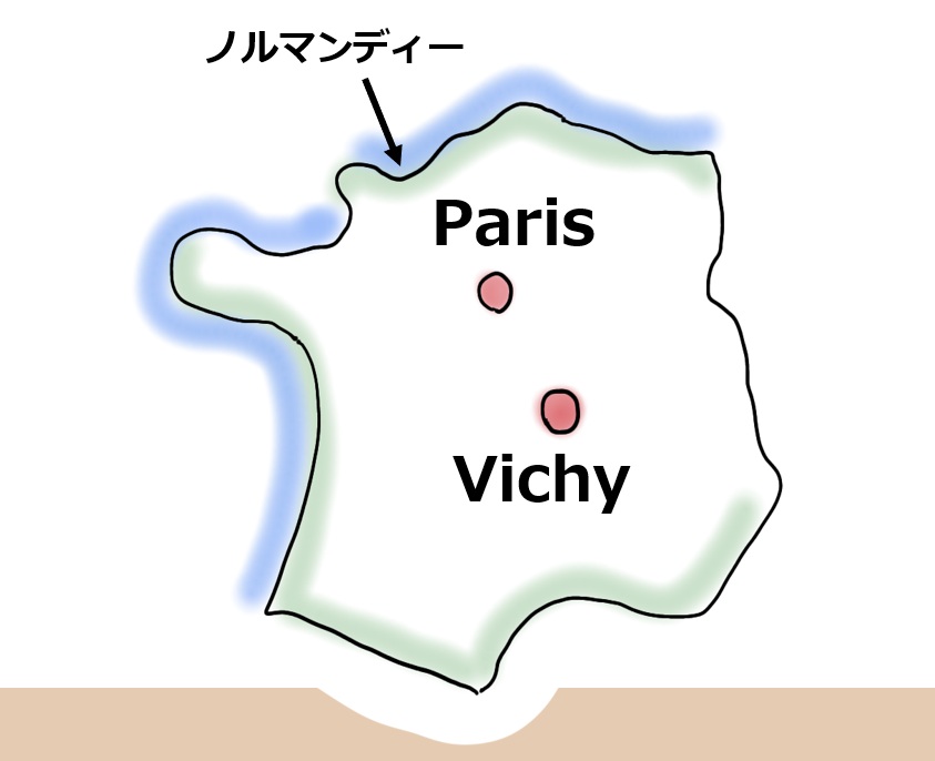 「どういうこと?」と思ったかもしれませんが、このVichy ヴィシーは第二次世界大戦のときに短期間だけ首都になった臨時の首都だったのです。パリがドイツに占領されてしまったので、停戦条約の後1940年7月にフランスの首都がパリからVichy ヴィシーに移りました。それから1944年に連合軍がノルマンディーに上陸しパリが解放されるまで約4年間、Vichy ヴィシーはフランスの首都として機能しました。