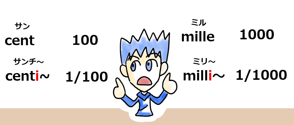 あれ?ちょっと待ってくださいメートルの1000分の1は「ミリメートル」ですね(フランス語では「millimètre」 ミリメトル)。つまり「milli~」ミリ~は「1000分の1」を意味します。