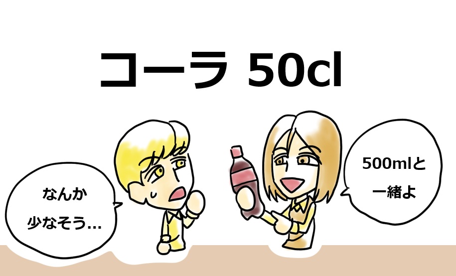 カフェやレストランで飲み物のメニューを見ると「50cl」とか「33cl」とか書いていますがこの「cl」は「centilitre」 サンチリトルの略です。「コーラ 50cl」と書かれるとなんだか少なそうに感じますが、これは「コーラ 500ml」という意味なので安心して注文してください。