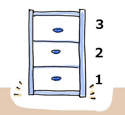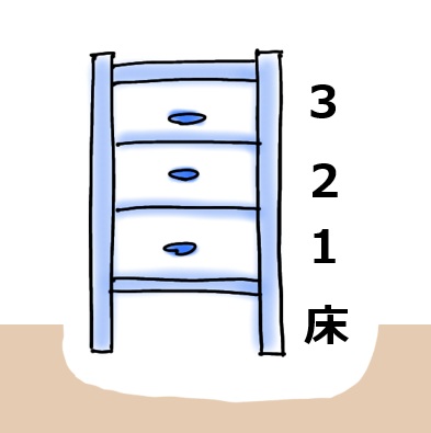 「そうか棚のイメージで数えているんだな」と思いましたが、ちょっと待ってください、下のイラストのように床とピッタリくっついているタイプの棚もありますね。この場合一番下の部分を1段目と数えます。しかもこっちの方が建物のイメージに近いです。うーん…この仮説はイマイチ納得感が薄いですね。