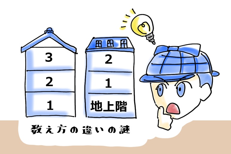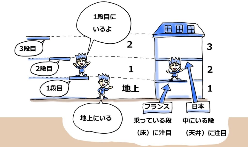 階数も同じです。下のイラストのように日本では中にいる段(天井)に注目しているのに対し、フランスでは乗っている段(床)に注目しているのではないでしょうか?