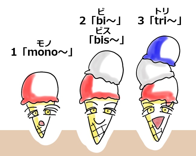 これには種類がいっぱいあって、例えば「1」を表すものは「mono~」以外でも「uni~」とか「prim~」とかもあります。この辺りもいつか書きたいと思います。