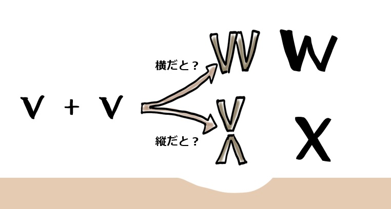 しかし待ってください。「V」はローマ数字で「5」を表しますよね。「V」を二つ合わせると「5」+「5」=「10」になります。「10」のローマ数字は「X」!しかも「X」は「V」を横に並べるのではなく上下反転させて縦に並べた形とも考えられます!そう考えると「V」+「V」は「W」ではなく「X」の方がふさわしいのではないでしょうか?