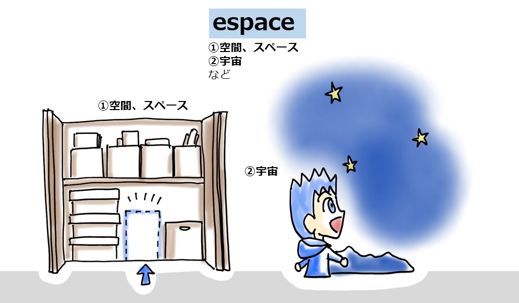 フランス語のespaceエスパス も同じく「空間(スペース)」「宇宙」という意味があります。ただこの二つの意味は考え方によっては同じ意味とも言えます。