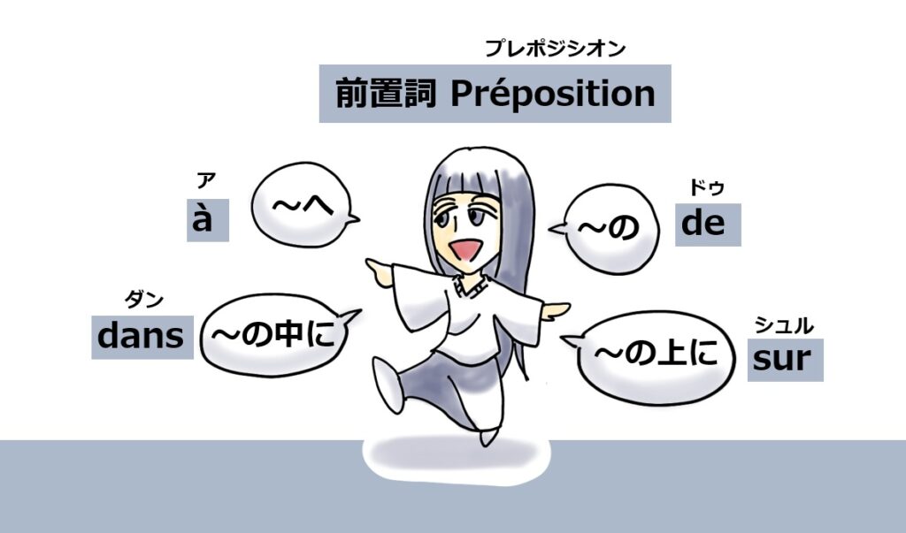 「le pain sur la table」「テーブルの上のパン」というように「パン」と「テーブル」の間に入ってそれらの単語を関連付けます。