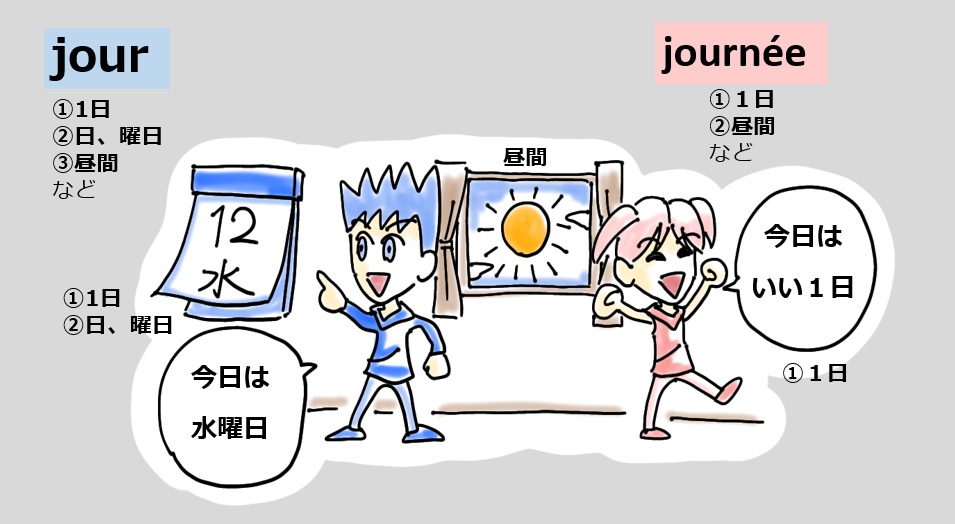 「日」は男性形だとjour ジュール、女性形だとjournée ジュルネ になります。