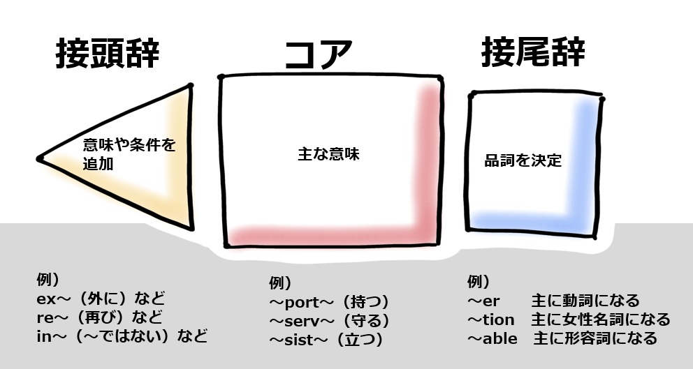 「接頭辞」(意味や条件を追加)+「コア」(主な意味)+「接尾辞」(品詞を決定)