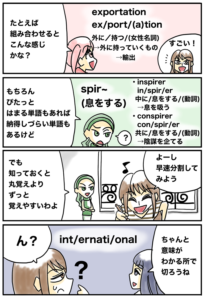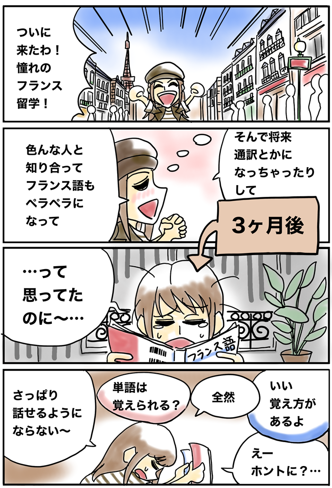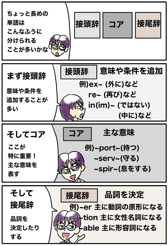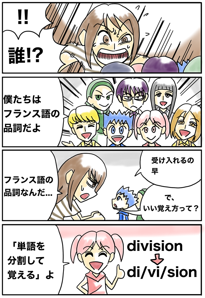 マンガで学ぶフランス語 文法など 2026.04.30 マンガでも読みながらフランス語 このサイトではこんな感じで楽しくフランス語を学べます。品詞についてもっと知りたい方はこちらをご覧ください。 イラストで覚えるフランス語の品詞フランス語の品詞の種類 フランス語単語はその用途によって「品詞」というグループに分けられます。このサイトではその中でも特に以下の品詞に注目して色で分けています。(これらの他にも代名詞、冠詞、接続詞、間投詞などがあります。)男性名詞、女性名詞... 今回出てきた「コア」が気になる方はこちらもご覧ください。port~serv~spir~