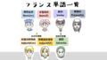 同じグループの単語をまとめて覚える まとめて覚える(グループ) 2024.10.182025.08.08 『~mener』のつく単語をまとめて覚える「~mener」のイメージ 「~mener」のイメージ「運ぶ、導く」 【語源】・~menerの語源はラテン語「minare」(導く)から来ている。 ここでまとめて覚えられるフランス語単語 イメージ「運ぶ、導く」●mener = mener ... 『~pliquer』のつく単語をまとめて覚える「~pliquer」のイメージ 「~pliquer」のイメージ「折る」 【語源】・~pliquerの語源はラテン語「plicare」(折りたたむ)から来ている。(*フランス語単語「plier」は「~を折る」という意味) 【注意】~pliqu... 『~lever』のつく単語をまとめて覚える「~lever」のイメージ 「~lever」のイメージ「上げる、起こす」 【覚え方】・カタカナ語の「レバー」と関連 →レバーを「上げる」 と覚えることも出来る ここでまとめて覚えられるフランス語単語 イメージ「上げる、起こす」●lever ... 『~entrer』のつく単語をまとめて覚える「~entrer」のイメージ 「~entrer」のイメージ「入る」 【覚え方】・カタカナ語の「エンター」(入ること)や「エントランス」(入口)と関連 ここでまとめて覚えられるフランス語単語 イメージ「入る」●entrer = entrer ... 『~jouir』のつく単語をまとめて覚える「~jouir」のイメージ 「~jouir」のイメージ 「喜ぶ」 ここでまとめて覚えられるフランス語単語 イメージ 「喜ぶ」●jouir = jouir 「(~を)喜ぶ」など●réjouir = ré + jouir 「(~を)喜ばせる... 『équi~』のつく単語をまとめて覚える「équi~」のイメージ 「équi~」のイメージ ①「等しい」②「装備、チーム」 ここでまとめて覚えられるフランス語単語 イメージ①「等しい」 ●équilibrer の関連語 ●équivaloir の関連語 ●équité = équ... 『~valoir』のつく単語をまとめて覚える「~valoir」のイメージ 「~valoir」のイメージ 「価値」 ここでまとめて覚えられるフランス語単語 イメージ 「価値」●valoir = valoir 「~の価値がある」など●équivaloir = équi + valoir... 『cour~』のつく単語をまとめて覚える「cour~」のイメージ 「cour~」のイメージ ①「走る、流れ」②「勇気」③「曲がる」④「中庭」 ここでまとめて覚えられるフランス語単語 イメージ①「走る、流れ」 ●courir の関連語 イメージ②「勇気」 ●~courage~ のつ... 『~courage~』のつく単語をまとめて覚える「~courage~」のイメージ 「~courage~」のイメージ 「勇気、気力」 ここでまとめて覚えられるフランス語単語 イメージ 「勇気、気力」●courage = cour + age 「勇気」など●courageux = cour... 『~courir』のつく単語をまとめて覚える「~courir」のイメージ 「~courir」のイメージ 「走る」 ここでまとめて覚えられるフランス語単語 イメージ 「走る」●courir = courir 「走る」など●concourir = con + courir 「(同じ目的... 『évid~』のつく単語をまとめて覚える「évid~」のイメージ 「évid~」のイメージ 「明白」 【覚え方】・é~(外に)+vid~(見える)→外に見えるほど明白 *vid~はビデオなどのvid(見える) ここでまとめて覚えられるフランス語単語 イメージ「明白」●éviden... 『bouch~』のつく単語をまとめて覚える「bouch~」のイメージ 「bouch~」のイメージ ①「ふさぐ」②「口」③「肉」 ここでまとめて覚えられるフランス語単語 イメージ①「ふさぐ」●boucher = bouch + er 「~をふさぐ」など●bouché = bouch ... 『~boucher』のつく単語をまとめて覚える「~boucher」のイメージ 「~boucher」のイメージ 「ふさぐ」 ここでまとめて覚えられるフランス語単語 イメージ 「ふさぐ」●boucher = boucher 「~をふさぐ」など●déboucher = dé + bouche... 『~rouler』のつく単語をまとめて覚える「~rouler」のイメージ 「~rouler」のイメージ 「転がす、巻く」 【覚え方】・カタカナ語の「ロール」、「ローリング」と関連 ここでまとめて覚えられるフランス語単語 イメージ 「転がす、巻く」●rouler = rouler 「転... 『~fait~』のつく単語をまとめて覚える「~fait~」のイメージ 「~fait~」(faireの過去分詞)のイメージ 「事、作品」 ここでまとめて覚えられるフランス語単語 イメージ 「事、作品」●fait = fait 「事柄」など●fait = fait /●faite = ... 『~sister』のつく単語をまとめて覚える「~sister」のイメージ 「~sister」のイメージ 「立つ」 ここでまとめて覚えられるフランス語単語 イメージ 「立つ」●insister = in + sister 「(~を)強調する」など●assister = a(s) + s... 『chauss~』のつく単語をまとめて覚える「chauss~」のイメージ 「chauss~」のイメージ「履物」 ここでまとめて覚えられるフランス語単語 イメージ「履物」●chausser = chauss + er 「(履物)を履く」など●chaussure = chauss + u... 『part~』のつく単語をまとめて覚える「part~」のイメージ 「~part~」のイメージ ①「分ける、部分」②「出発」 【覚え方】・①カタカナ語の「パート」、「パーツ」と関連 ここでまとめて覚えられるフランス語単語 イメージ①「分ける、部分」●part = part 「分担」... 『viol~』のつく単語をまとめて覚える「viol~」のイメージ 「viol~」のイメージ ①「紫色」②「暴力」③「バイオリン」 【覚え方】・①カタカ